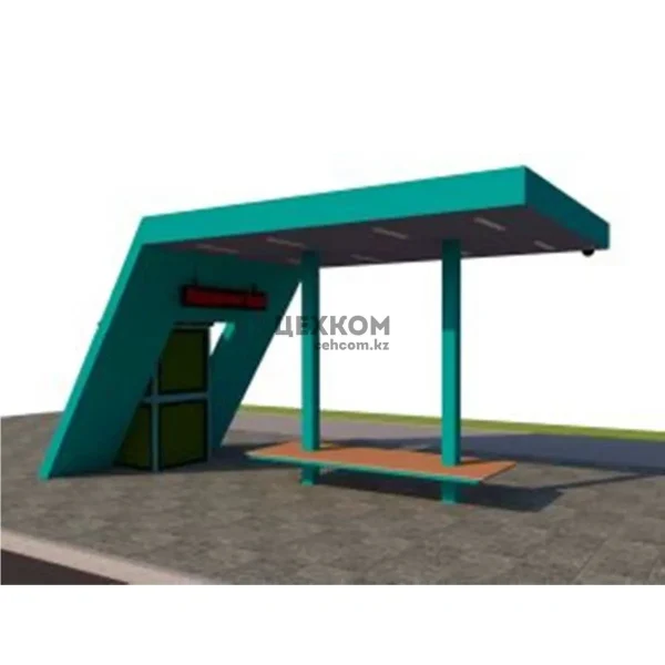 Модульная комбинированная конструкция специализированного назначения полуоткрытого типа; каркас –металлический; крыша с металлической обвязкой и обрешеткой, покрытие и подшивка крыши, указатель маршрута – лист, оцинкованный с полимерным покрытием; заполнение лайт –боксов, ограждающие панели – калёное стекло (триплекс); скамья –деревянная. Габаритные размеры конструкции: длина- 6,0 м; ширина- 1,8 м, 1,4 м; высота-2,6 м; масса- 911 кг